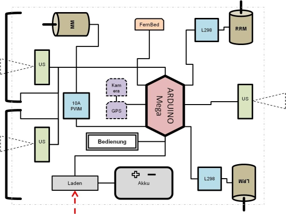 - Arduino Mega mit speziellen Module für Antrieb und Sensorik